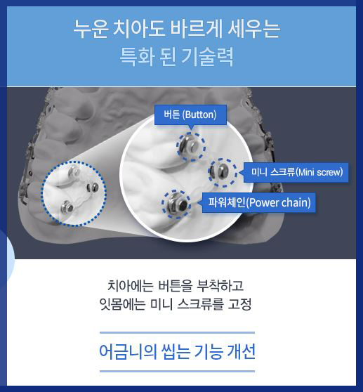 치아에 버튼을 부착하고 잇몸에는 미니스크류를 고정해