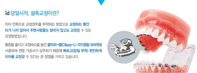 안쪽으로 교정기를 부착하여 치료 받는 동안