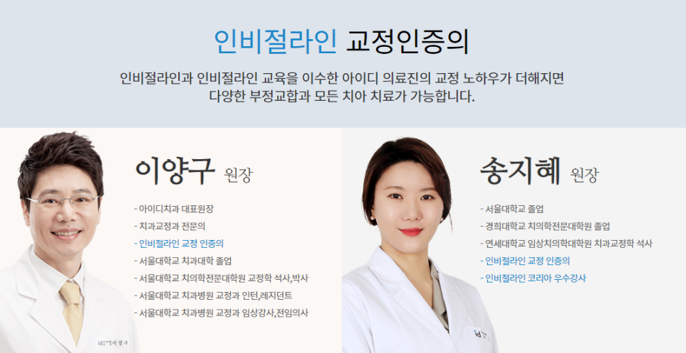 일반 교정장치와 다르게 인비절라인 교정 장치는 교정 치료 정문의 중 인비절라인 교육을 이수한 치과 의사만이 인비절라인 치료를 제공할 수 있습니다. 적합한 치료 계획을 세우고 예상되는 치아 이동 포함을 설계하여 개인형 맞춤 인비절라인 치료를 진행할 수 있는 치과 병원을 찾으셔서 진행하시기 바랍니다.
