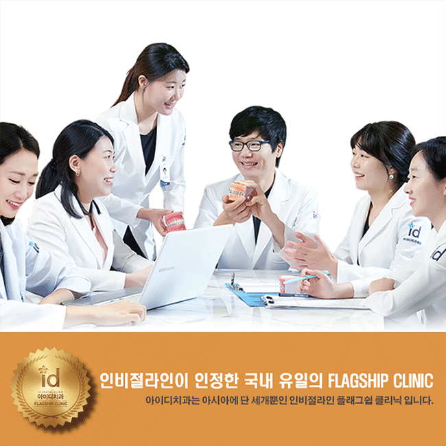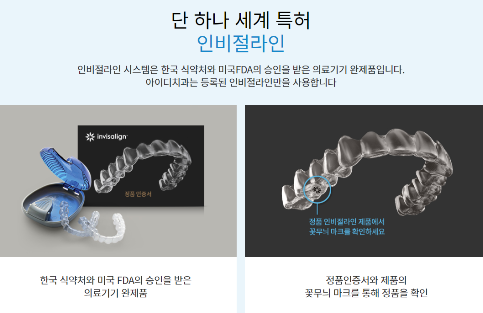 인비절라인 교정 시에는 인비절라인 정품 인증서 및 인증 치과임을 확인해보시고 진행하는 것이 좋습니다. 인비절라인 플래그쉽으로 선정된 아이디치과에서는 한국 식약처와 미국 FDA의 정식 승인을 받은 정품 교정장치만을 사용하고 있으며, 교정 진행 시 정품 인증서를 함께 발부해 드리고 있습니다. 또한, 인비절라인 교정장치 어금니 부분 하단의 꽃무늬 마크를 통해 정품임을 확인해보실 수 있어 편리합니다.