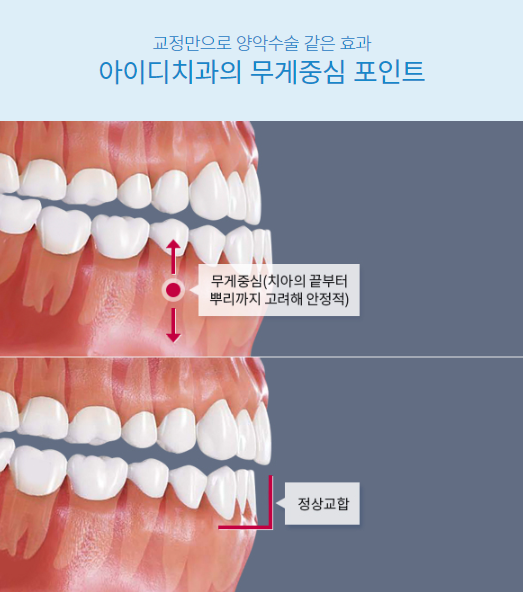 치아의 중심 포인트를 정확하게 진단하지 못한 상태에서 교정치료를 진행할 경우 안쪽으로 누운 치아, 일명 합죽이 형태의 결과물을 가져올 수 있습니다. 그렇기 때문에 치아의 끝부터 뿌리 상태까지 고려한 정확한 무게중심을 포인트로 정상교합을 맞추어야 만족도 높인 결과물을 기대할 수 있습니다.