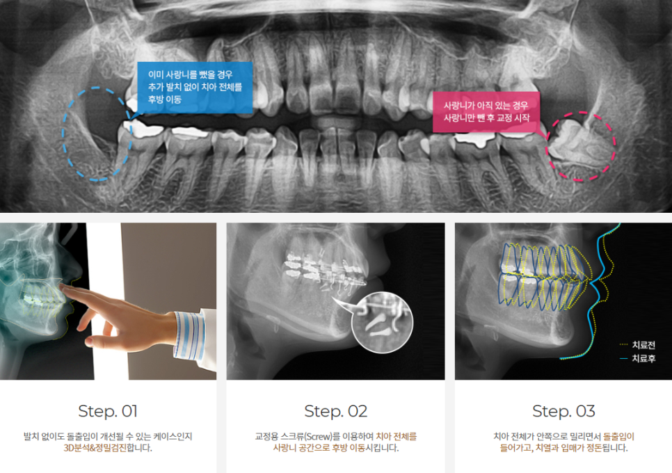 아이디치과에서는 자연치아 발치 부담감을 줄이기 위해 사랑니 공간을 활용하여 돌출입교정 치료를 진행합니다.