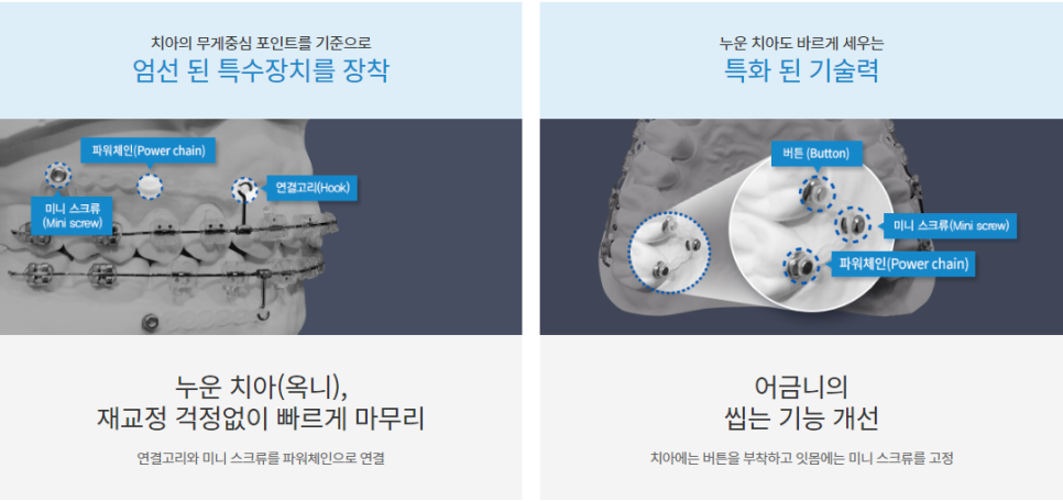 돌출입교정 시에는 무조건적인 발치 없이 최대한 자연치아 그대로 유지할 수 있도록 임상경험이 풍부한 교정과 의료진을 통해 진행하는 것이 좋습니다. 치아의 이동 및 각도 변화를 예측하고 무게중심 포인트를 기준으로 엄선된 특수장치를 부착해 진행해야만 오차 범위를 최소화시킨 만족도 높은 결과물을 얻을 수 있습니다.