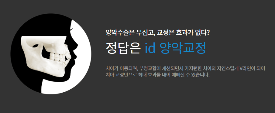 아이디치과병원은 교정과,보철과,구강악안면외과 분과별 전문의 협진 시스템으로 체계적인 치료 플랜과 만족도 높은 결과를 선사할 수 있습니다. 돌출입,주걱턱,과개교합 등 부정교합 문제로 양악수술 혹은 교정치료를 고려하고 계시다면 보다 정확도 높은 진단 및 면밀한 상담을 통해 현재 상태에 맞는 치료방법을 선택하시기 바랍니다.
