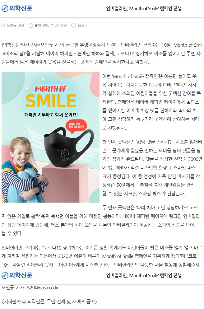인비절라인 코리아에서 Month of Smile 캠페인을 실시합니다.