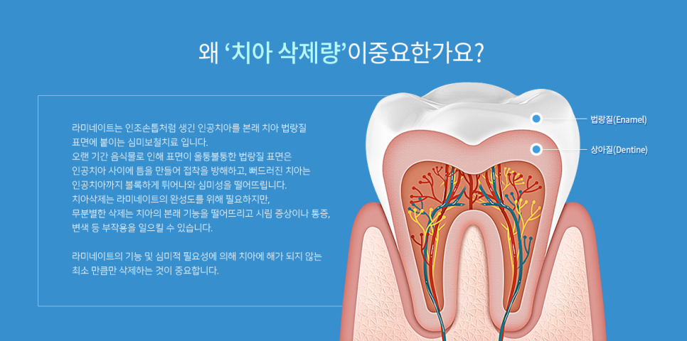 치아는 간단하게 바깥쪽 치아를 이루고 있는 법랑질과 안쪽 신경을 감싸고 있는 상아질로 구분지을 수 있으며, 라미네이트 치료 시에 삭제하는 부분은 치아 겉 표면인 법랑질이 되겠습니다. 법랑질은 자체적으로 혈관이나 신경을 가지고 있지는 않으나, 크게 탈락하거나 삭제되어 상아질이 드러나게 된다면 치아가 시린 증상을 야기할 수 있게 됩니다. 하지만, 오랜 기간 음식물로 인해 표면이 울퉁불퉁한 법랑질 표면은 인공치아와 실제 치아 사이에 틈을 만들게 되며, 이로 인해 접착이 방해될 수 있으며 뻐드러진 치아는 인공치아까지 볼록하게 튀어나와 심미성을 떨어뜨리기에 치아삭제는 라미네이트의 완성도를 위해서는 꼭 필요한 부분입니다.