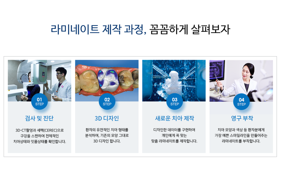 하지만 최근 라미네이트 방식은 이를 대폭 개선하여, 세렉(CEREC)을 이용해 개개인이 가진 치아의 모양을 그대로 구현하여 맞춤 제작하는 것이 특징입니다. 기존에 사용하던 도자기를 겹겹이 쌓아 올리는 방식이 아니기 때문에 사이사이 내부에 빈틈이 없어 응집력이 강하고, 내면이 균일하며, 한 덩어리로 이루어져 있기 때문에 경계부위가 따로 없으니 그로 인해 강도는 높아지고 깨짐과 탈락의 우려가 현저히 적다고 볼 수 있습니다. 또한, 그 기술력 또한 높아져 영점일미리 정도 혹은 무삭제로 시술이 가능한 영점일라미네이트도 가능하기에, 그에따라 치아에 가하는 손상이 거의 없으며, 환자가 원한다면 언제든 라미네이트를 제거해 원래의 치아 상태로 되돌아갈 수 있다는 큰 장점이 있습니다.