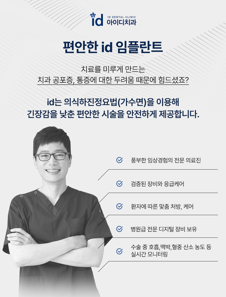 치과에서도 충분히 모니터링이 가능하고, 시술할 수 있지만 아이디치과는 누구에게나 더 안전한 시스템을 제공하고자 다방면으로 노력하고 있습니다.