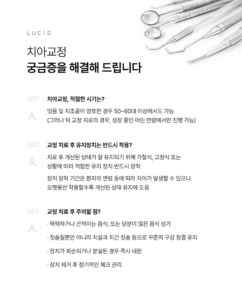 A. 성장기 어린이는 턱 성장 조절을 함께 진행할 수 있어서 빠를수록 좋아요. 하지만 성인도 치아와 잇몸이 건강하다면 언제든 교정 치료가 가능하답니다.