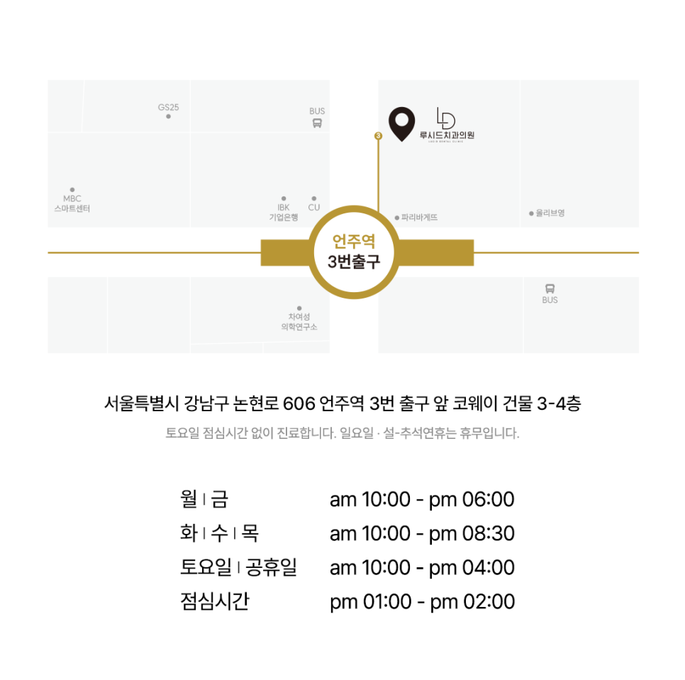 📍주소 서울특별시 강남구 논현로 606 언주역 3번 출구 앞 코웨이 건물 3-4층 🚗주차 서울 강남구 논현동 192-15 위 주소로 검색하시어 오시면 건물 주차장에 주차 가능하십니다. ⏰진료시간 저희 루시드치과는 환자분들의 편리한 치과치료를 위해 화,수,목 야간진료와 토요일 주말진료를 진행하고 있습니다. ...