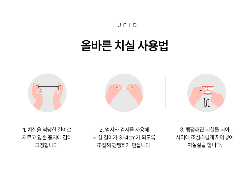 치실을 적당한 길이로 잘라 양손 중지에 감아 고정합니다. 너무 짧으면 조절이 어렵고, 너무 길면 힘 조절이 쉽지 않습니다.