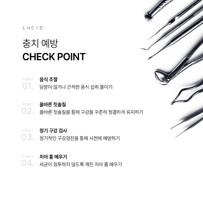 올바른 양치 습관을 유지하고 식습관을 관리하며 정기적인 루시드 치과 검진을 통해 치아 상태를 확인하는 것이 중요합니다. 치아는 한 번 손상되면 자연적으로 회복되기 어렵기 때문에 무엇보다 예방과 꾸준한 관리가 중요합니다.
