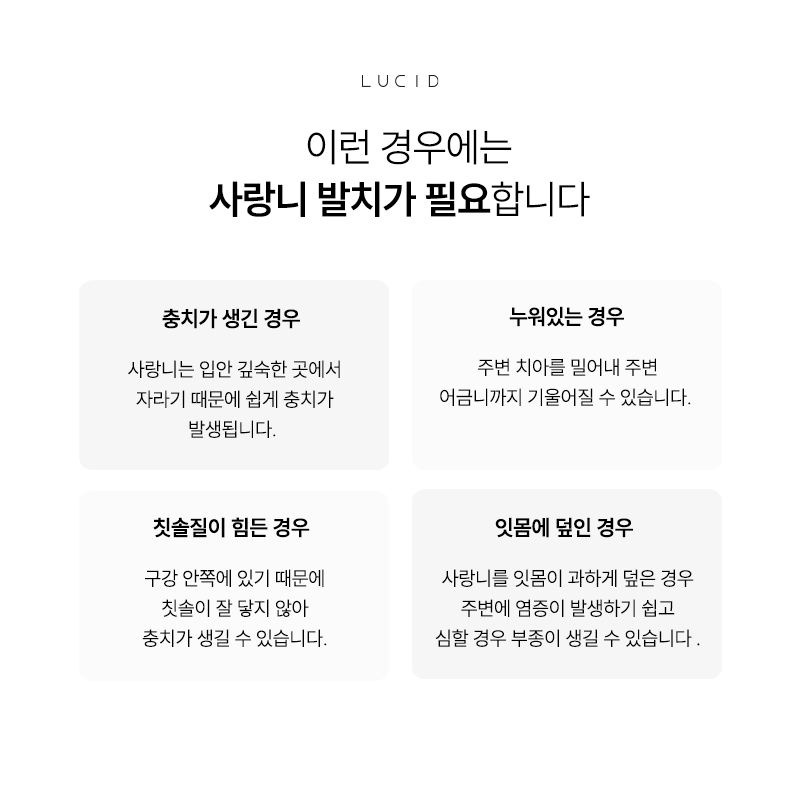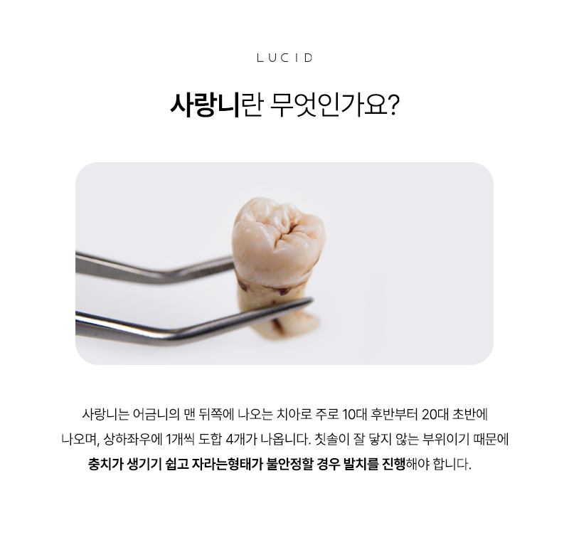 사랑니 발치가 고민되신다면 루시드치과 상담을 통해 현재 구강 상태를 확인해 보시기 바랍니다.