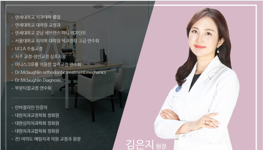 저희 대표원장님이신 김은지 원장님은 연세대학교 치과대학에서 치아교정을 전공하시고 석사학위까지 하고