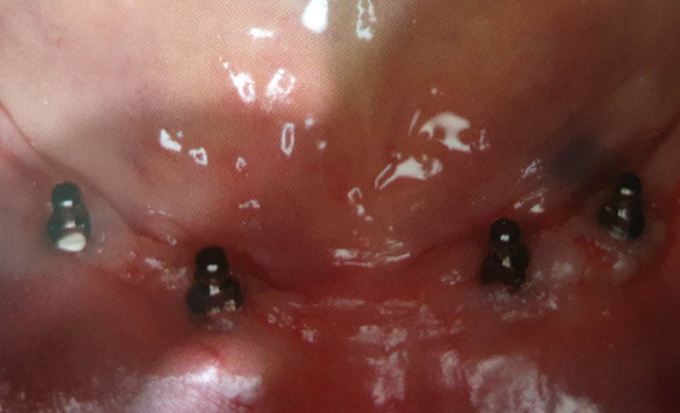 식립한 임플란트가 자신의 잇몸뼈에 잘 유착이 되는데 이때 위의 사진과 같이 단추모양의 어버트먼트를 연결합니다.