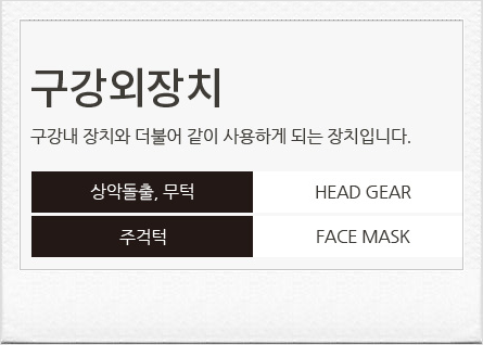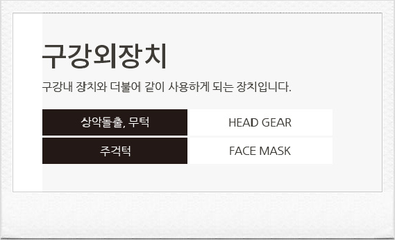 구강 외 장치로는 헤드 기어 와 페이스 마스크를 주로 하게 되는데