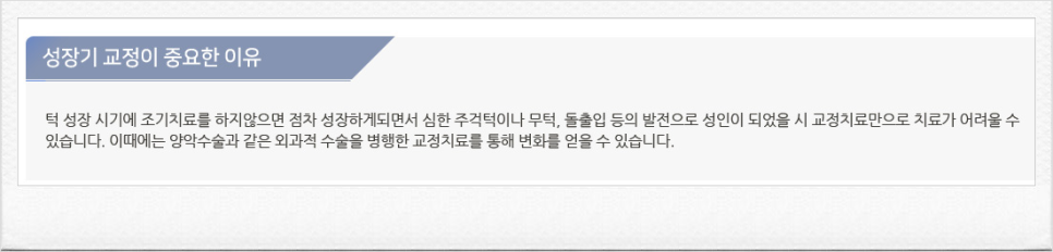 턱 성장 시기에 조기치료를 하지 않을 경우 주걱턱이나 무턱 돌출입 등으로