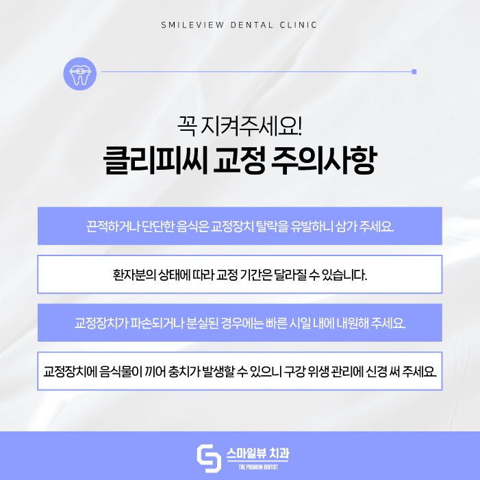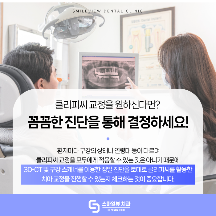 따라서 3D-CT 및 구강 스캐너를 이용한 정밀 진단을 토대로 클리피씨를 활용하여 치아 교정을 진행할 수 있는지 체크해 보시는 것이 중요해요.