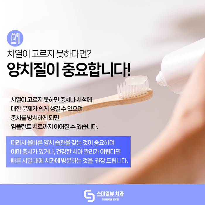 기본적으로 치열이 고르지 못하다면 치열이 가깝거나 틀어져 있는 경우가 대부분이기 때문에 이로 인해 충치나 치석에 대한 문제가 생기는 경우가 많아요.