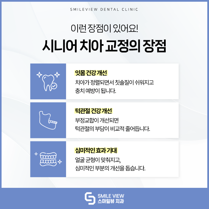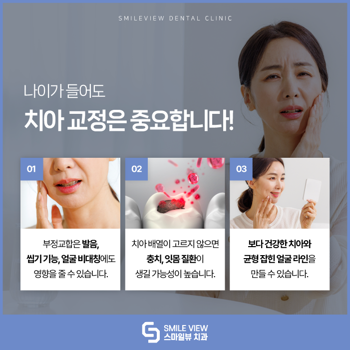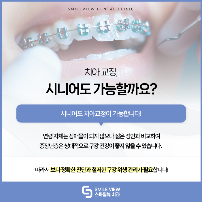 논현동치아교정 시니어 세대도 교정할 수 있을까? 안녕하세요. 스마일뷰치과입니다. 나이가 들수록 구강과 잇몸의 건강은 누구에게나 중요한 관심사가 됩니다. 흔히 치아 배열을 바로잡는 과정은 청소년이나 젊은 세대에서만 이루어진다고 생각하기 쉽지만, 실제로는 중·장년 이후에도 이를 고민하는 분들이 늘어나고 있는데요....