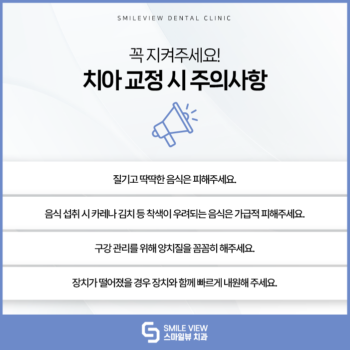 김치, 커피, 카레 등 착색이 심한 음식은 장치와 치아에 얼룩이 남을 수 있으므로 주의가 필요합니다.