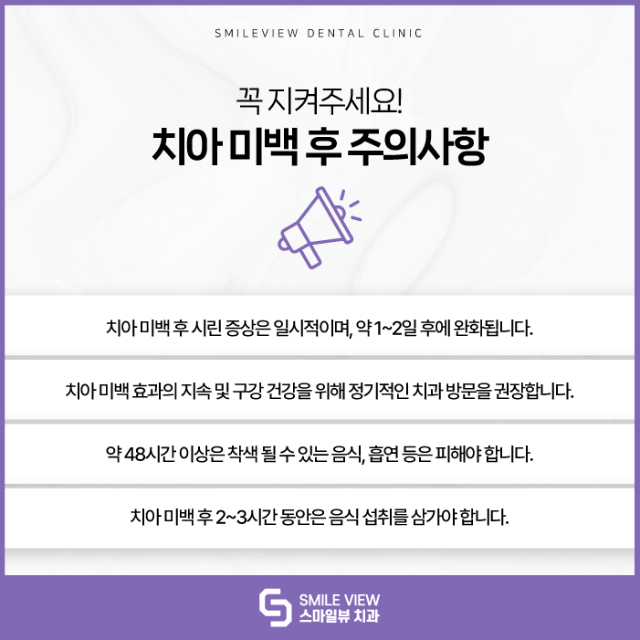 일시적인 시림 증상: 서울치아미백 시술 후 구강 내 구조물이 일시적으로 시릴 수 있으나, 대부분 1~2일 이내 자연스럽게 완화됩니다.
