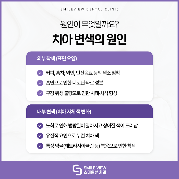 외부의 착색은 우리가 자주 섭취하는 커피, 홍차, 와인, 탄산음료 등의 색소가 표면에 침착되면서 발생합니다.