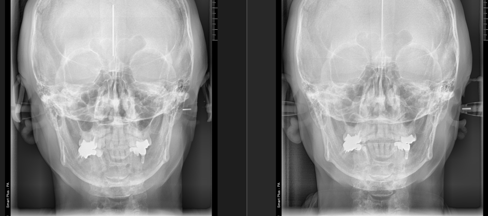 본 환자분은 오른쪽 턱관절이 불편해서 치료를 받은이력이 있고, 교정은 안으로 들어간 치아를 펼치기 위해 하셨습니다. 이런 경우 치아의 비대칭에 의해서 턱관절까지 불편해지고, 얼굴까지 비뚤어졌었습니다. 그런데 역으로 생각해보면 치아교정을 해서 치아를 펴주어서 올바른 위치로 턱관절이 정렬되고 비대칭까지 좋아질수있다는 점을 알 수 있습니다. 왼쪽의 비포에 비해서 오른쪽 이 훨씬 안정된 위치를 보여주고 있음을 알 수 있습니다.